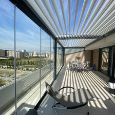 Eine flexible Glasschiebewand, die Schutz vor schädlichen UV-Strahlen, intensiver Sonne, Wind und Regen bietet.